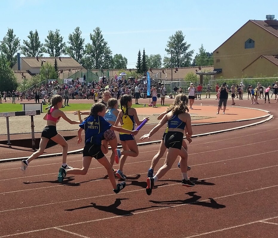 Vihdin Viesti oli mukana 26.5. käydyissä pm-viesteissä Järvenpäässä. Seura osallistui yhteensä 9 eri sarjaan tyttövoittoisella kokoonpanolla: - 9-vuotiaat tytöt ja pojat sukkulaviestiin - Tytöt 11 4x60m aitajuoksu, 4x50m ja 4x600m viestiin - Tytöt 13 4x60m aitajuoksu, 4x100m ja 4x600m viestiin - Tytöt 15 4x100m ja 4x800m viestiin Järvenpää ja lämmin ilma ei pettänyt vihtiläisiä tälläkään kertaa. Parhaiten onnistui 13-vuotiaiden tyttöjen joukkue 4x100m pikaviestissä, jossa tuli voitto kotiin kelpo ajalla 55,71. Joukkueessa juoksivat Iina Tienhaara, Julia Suihkonen, Magdaleena Havukorpi ja Anni Napari. Koko kisan tulokset ovat luettavissa tilastopaja.fi -sivuilta. |